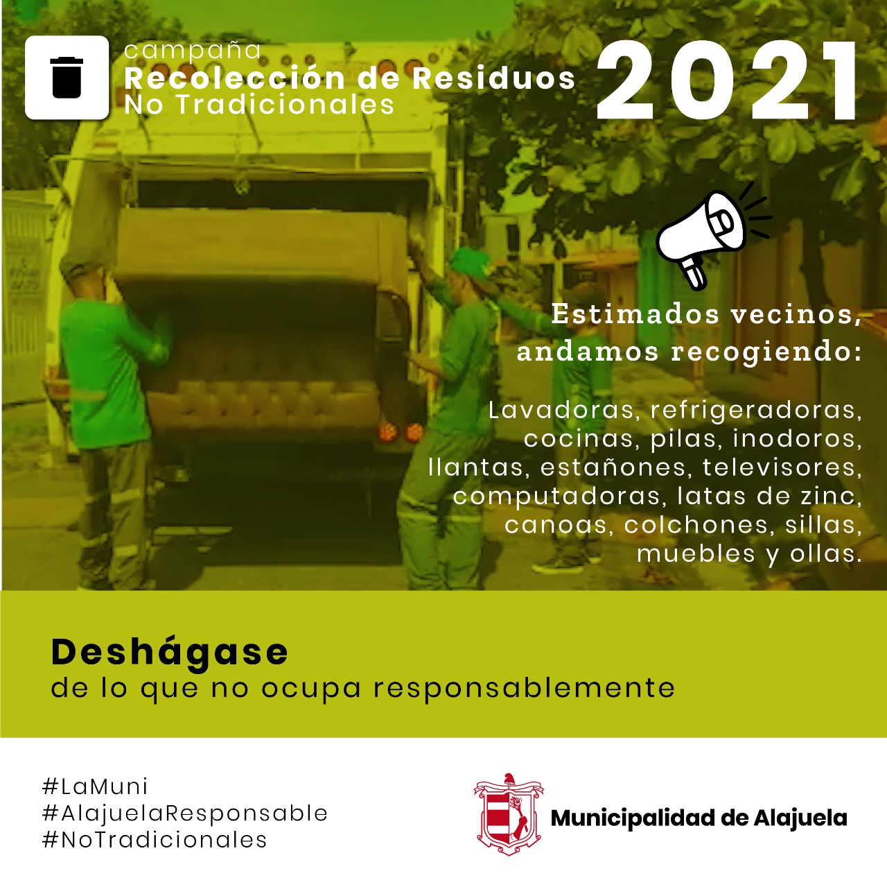 Como parte del servicio a la comunidad que se realiza bajo la coordinación de la Actividad Gestión Integral de Residuos Sólidos de la Municipalidad de Alajuela; se recogerán artículos tales como: lavadoras, refrigeradoras, cocinas, pilas, inodoros, llantas, estañones, televisores, computadoras, latas de zinc, canoas, colchones, sillas, muebles y ollas, que serán retirados en las rutas establecidas por camiones debidamente rotulados.
